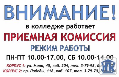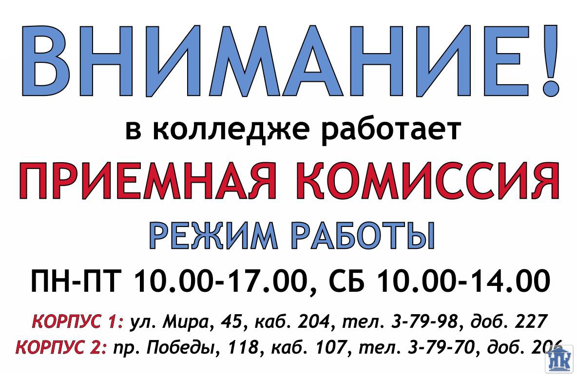 ПРИЕМНАЯ КОМИССИЯ РАБОТАЕТ С 20 ИЮНЯ ПН-ПТ с 10.00 до 17.00, СБ с 10.00 до 14.00 корпус 1, каб. 204, тел.: 3-79-98, доб. 227, корпус 2, каб. 107, тел.: 3-79-70, доб. 206.