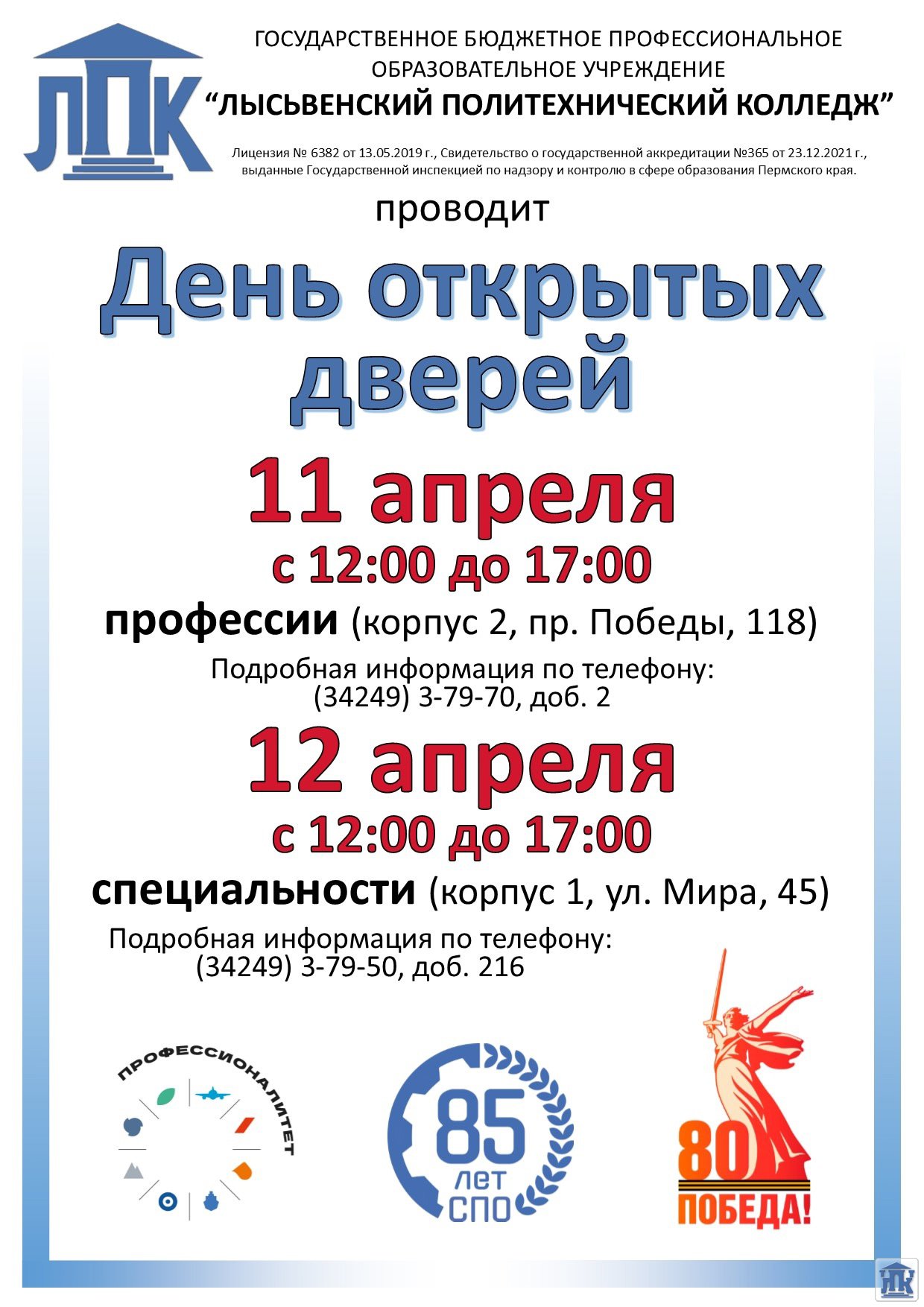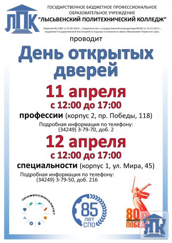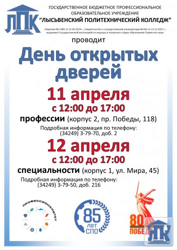 Пермский край, г. Лысьва, ул. Мира, д. 45, тел.: 8(34249) 3-79-70, доб. 205, 8(34249) 3-79-50, доб. 215, e-mail: gbpou-lpk@lpk.permkrai.ru