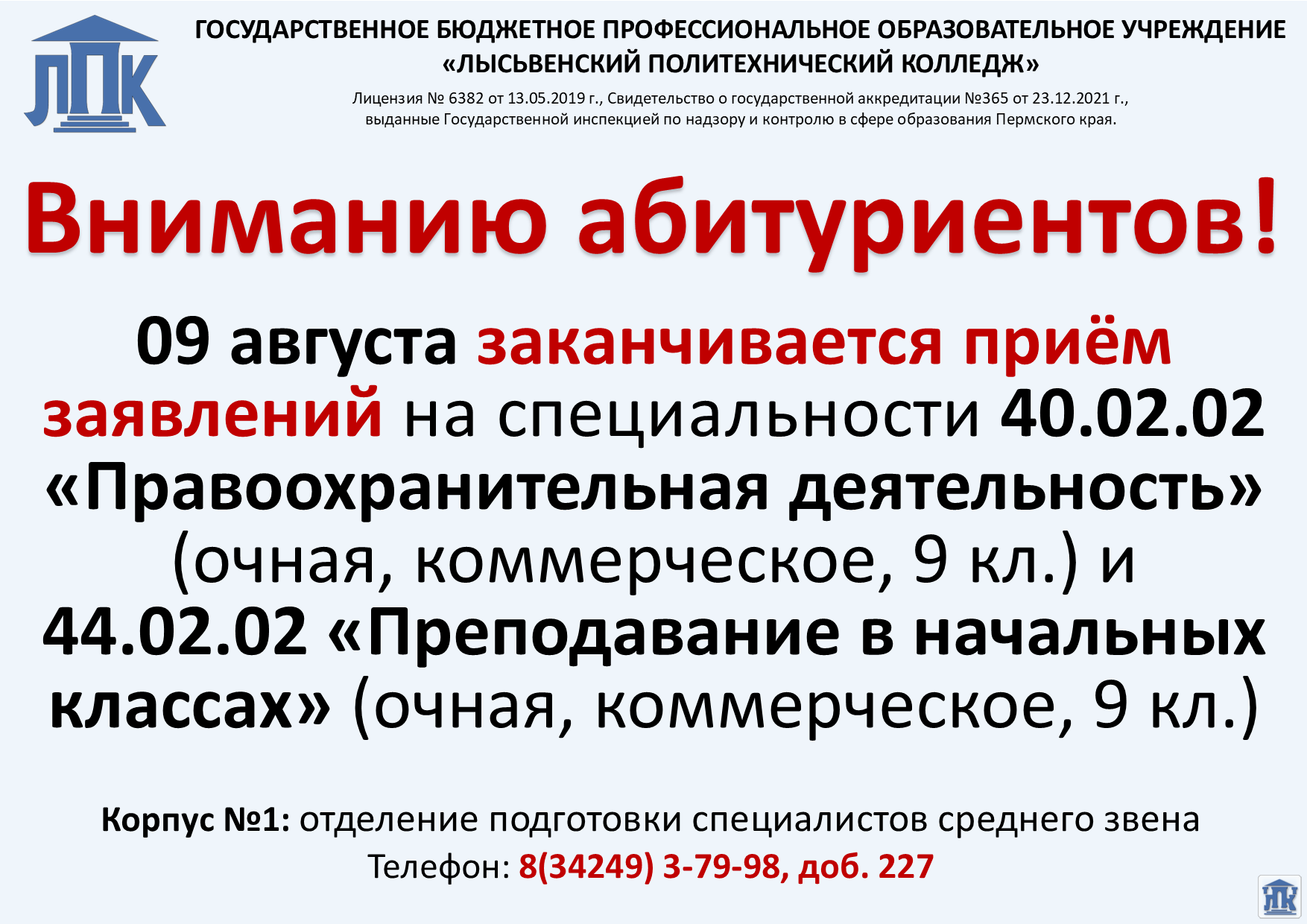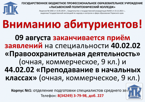 15 августа - последний день приема заявлений на поступление на бюджетное обучение;