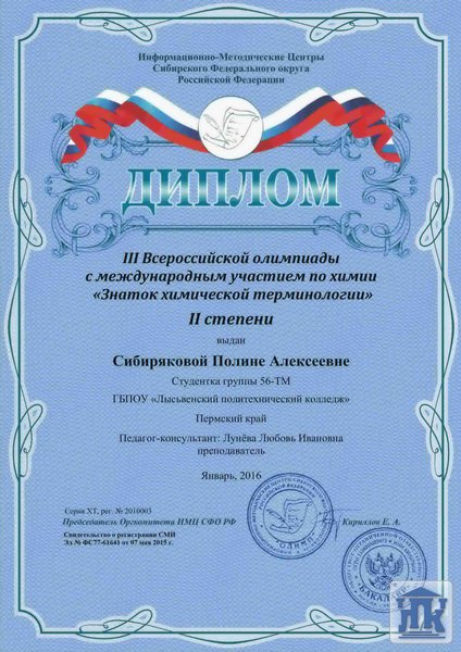Всероссийская олимпиада «Знаток химической терминологии» В январе были подведены результаты 3 Всероссийской олимпиады с международным участием «Знаток химической терминологии». За успешное участие Сибирякова Полина, студентка группы 56-ТМ, награждена дипломом 2 степени. Поздравляем!