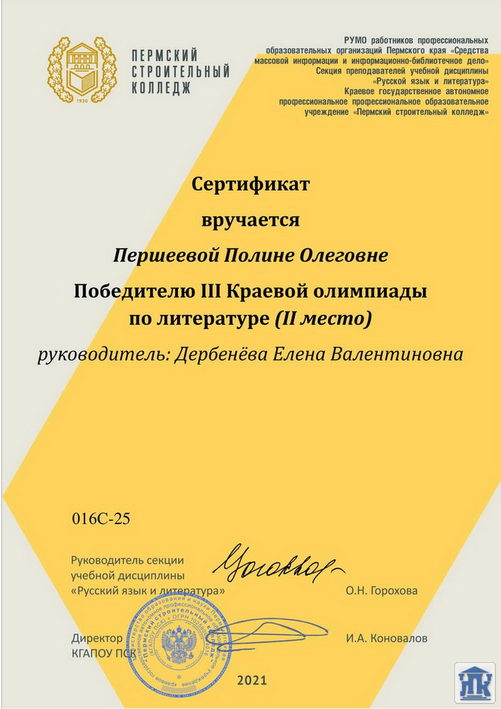 26 марта на базе Пермского стоительного колледжа проходила III Краевая олимпиада по литературе. Студентка группы 11-20-СТ Першеева Полина стала победителем, заняв 2 место