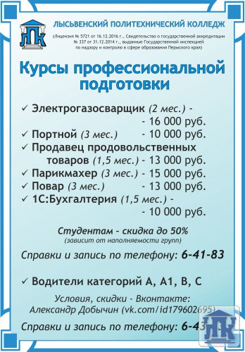 Пермский край, г. Лысьва, ул. Мира, д. 45, тел.: 8(34249) 3-79-70, доб. 205, 8(34249) 3-79-50, доб. 215, e-mail: gbpou-lpk@lpk.permkrai.ru