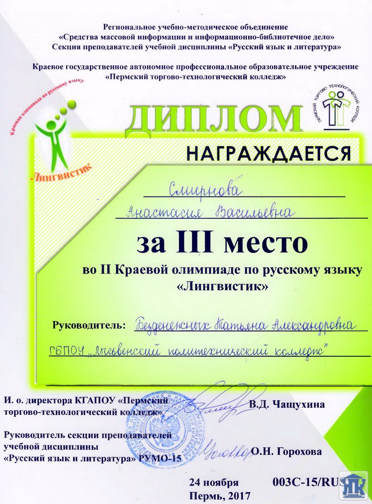 24 ноября на базе КГАПОУ «Пермский торгово-технологический колледж» состоялась Краевая олимпиада по русскому языку «Лингвистик» и заседание секции преподавателей учебной дисциплины «Русский язык и литература»