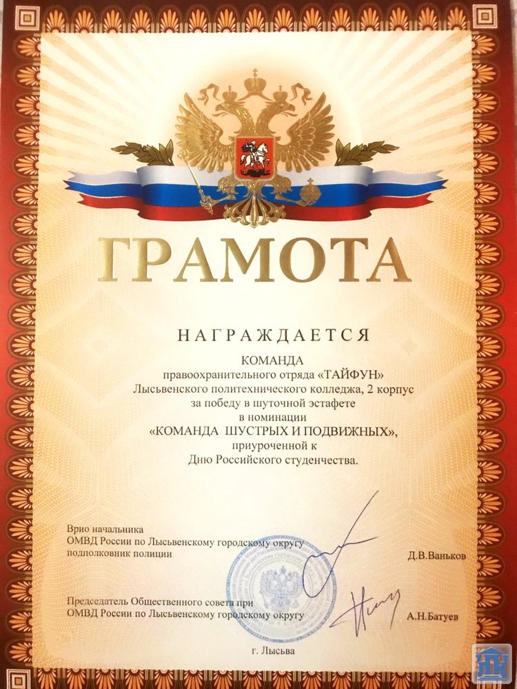 Правоохранительный отряд «Тайфун» колледжа под руководством И.Г.Мазитова награжден грамотой за победу в эстафете, приуроченной Дню Российского студенчества. Молодцы! Так держать!
