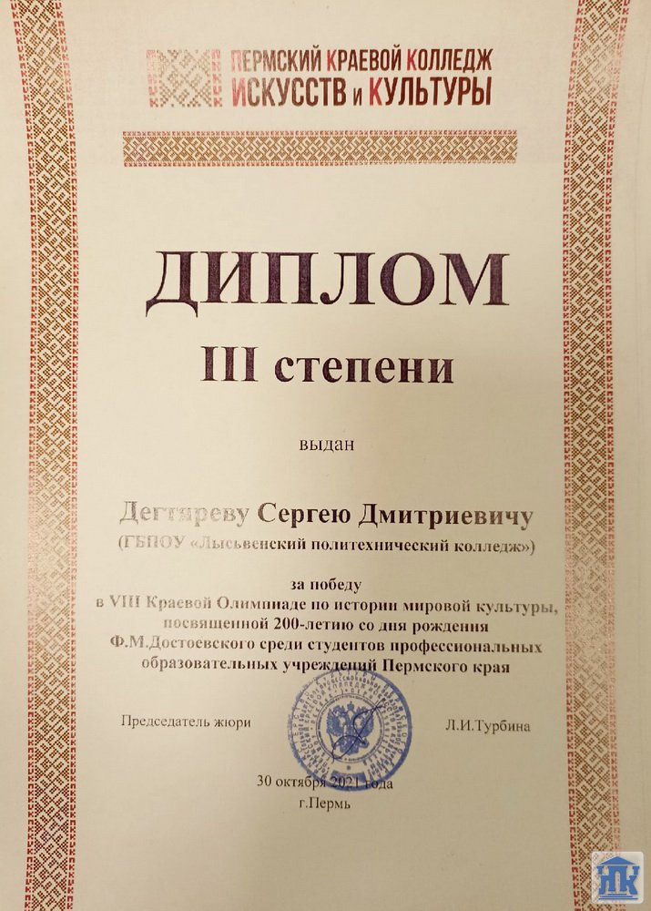 Поздравляем студента группы 203-20-МАВ Сергея Дегтярёва с призовым 3 местом в краевой олимпиаде по истории мировой культуры, посвящённой 200-летию со дня рождения Ф.М. Достоевского!