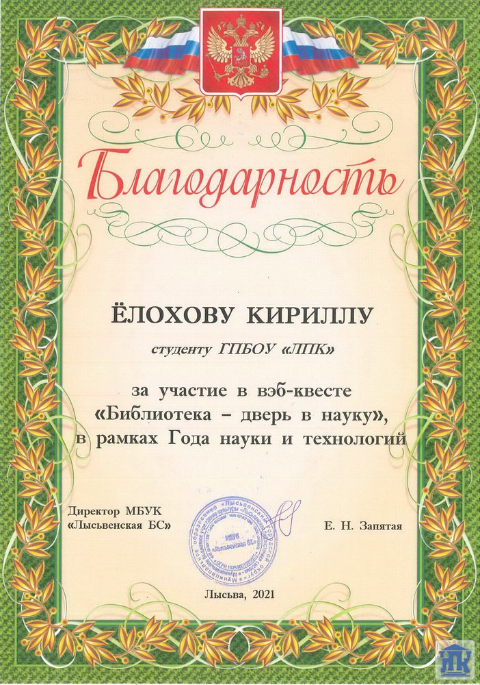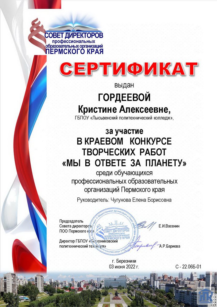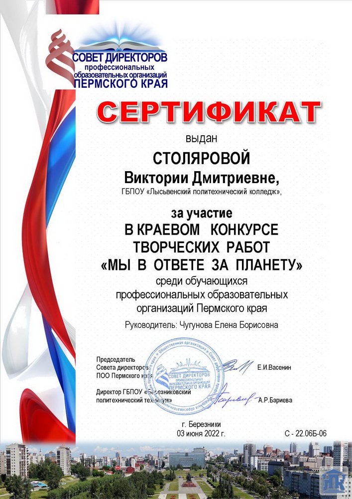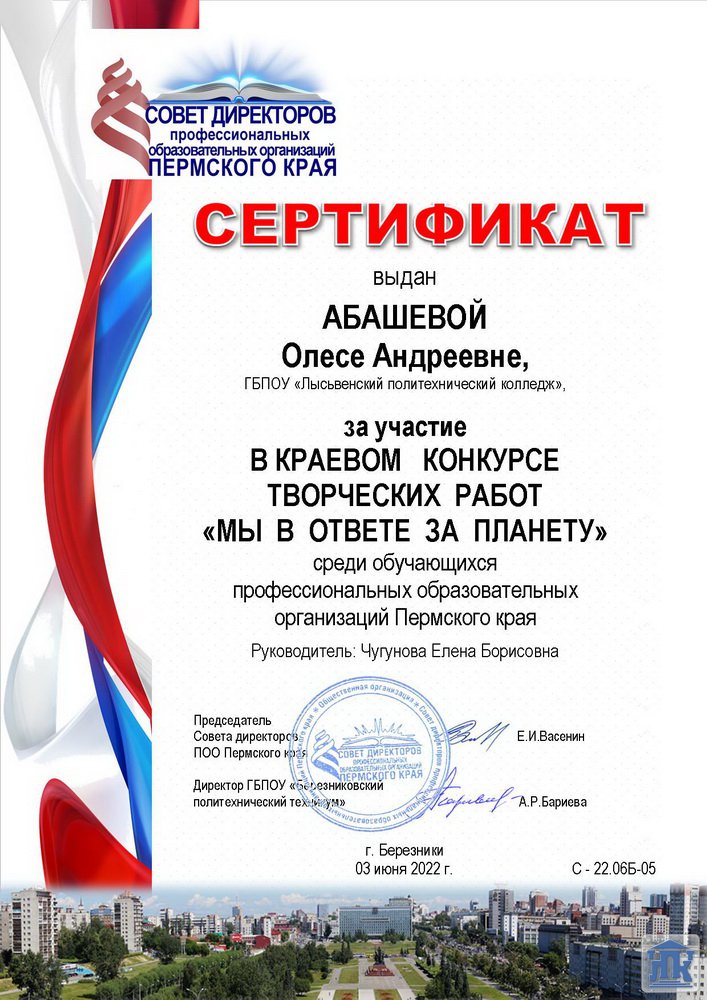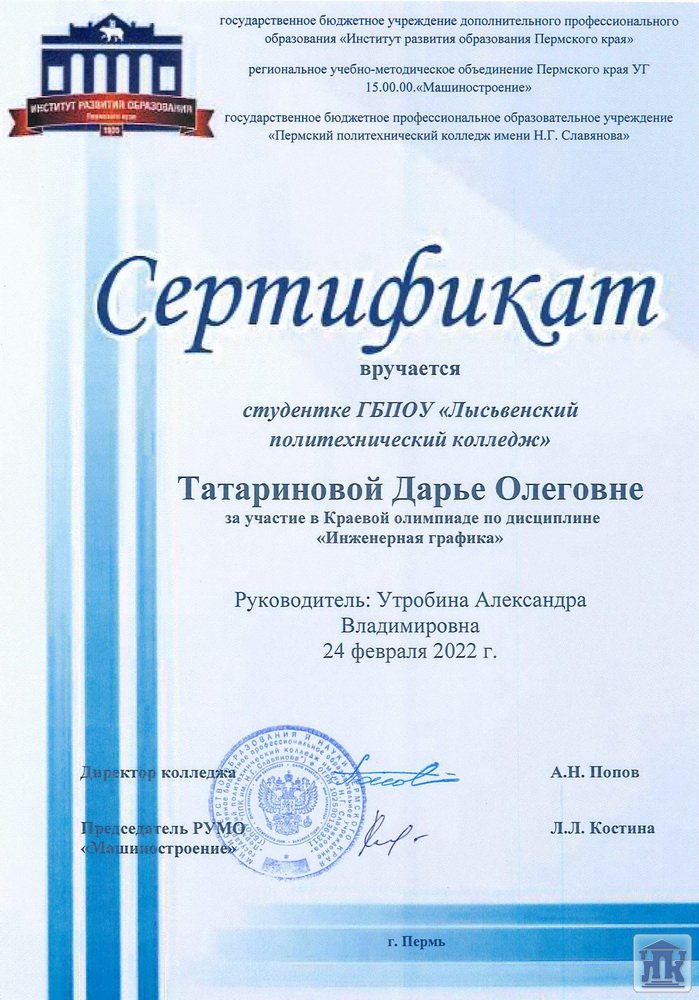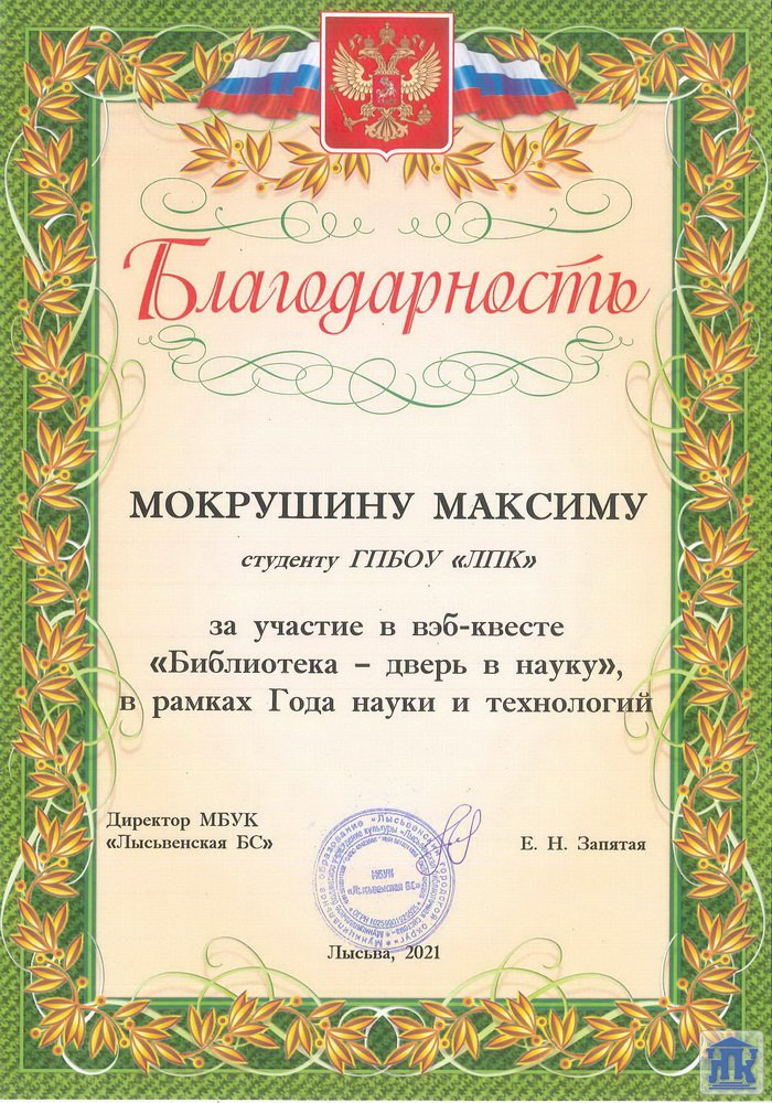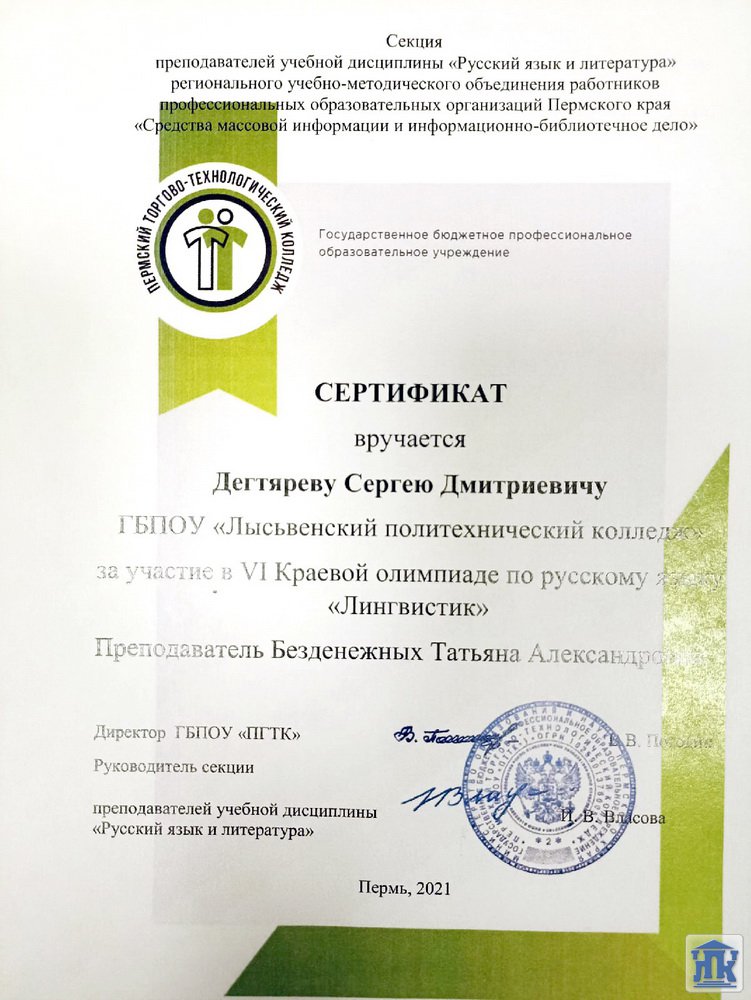 Пермский край, г. Лысьва, ул. Мира, д. 45, тел.: 8(34249) 3-79-70, доб. 205, 8(34249) 3-79-50, доб. 215, e-mail: gbpou-lpk@lpk.permkrai.ru