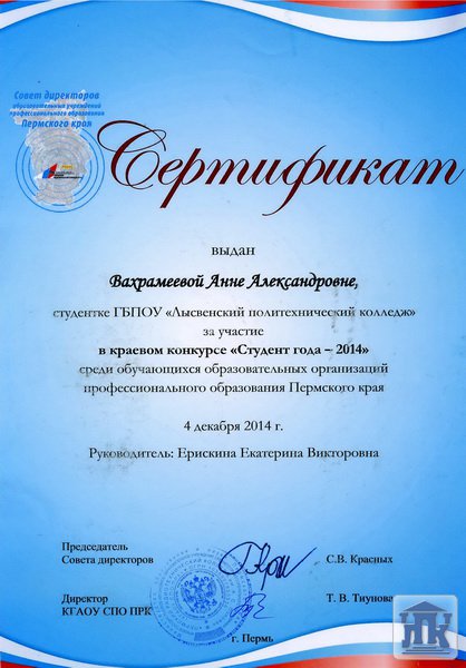 4 декабря студентка Лысьвенского политехнического колледжа Вахрамеева Анна (47-УК) защищала честь нашего учебного заведения на краевом конкурсе «Студент года», проходившем в г.Перми в Радиотехническом колледже имени А.С. Попова.