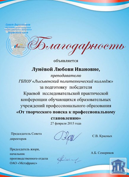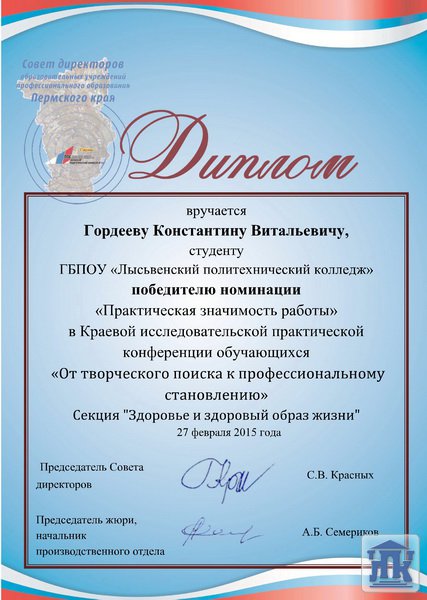 Среди 27 докладчиков Лысьвенский политехнический колледж представляли 5 студентов в 2 секциях. Победителями в номинации «Научная и практическая значимость работы» стали Гордеев Константин из группы 14-14-ЭО с работой «Нитраты: миф или реальность?» и Шуклин Никита (группа 37-УК) с проектом «Олимпиадные задачи по электротехнике».