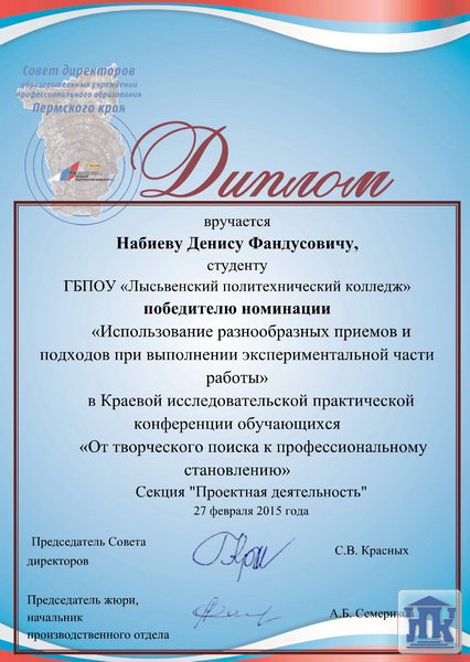 В номинации «Использование разнообразных приёмов и подходов при выполнении эксперимента» победа досталась Набиеву Денису из группы 28-КС с проектом «Применение профессиональных компетенций в создании сайта по химии».