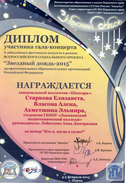 12 февраля в Пермском авиационном техникуме прошел традиционный фестиваль «Звездный дождь». Лысьвенский политехнический колледж уже не первый год принимает участие в этом мероприятии. В этом году колледж представил гостям фестиваля два номера: танец «Кто я, когда я сплю?» и «Креативный художник».