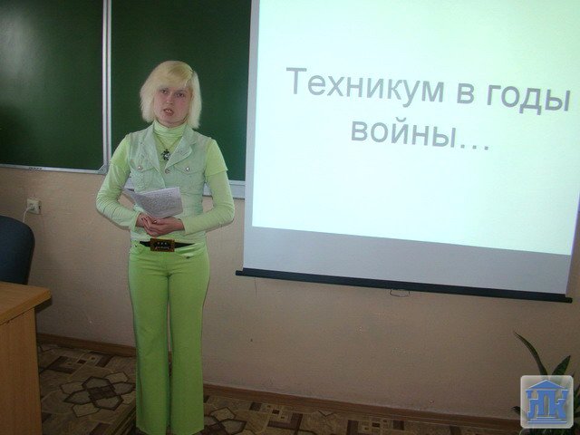 В колледже проводится много мероприятий, посвящённых 65-летию Победы в Великой Отечественной войне. Одно из них – устный журнал «Наш техникум в годы войны». Его подготовили девушки из группы 15ЭК: Хафизова Илона, Шпаковская Инна, Сырчина Ольга, Зорина Полина. Они выступили перед студентами всех 7 групп первого курса.