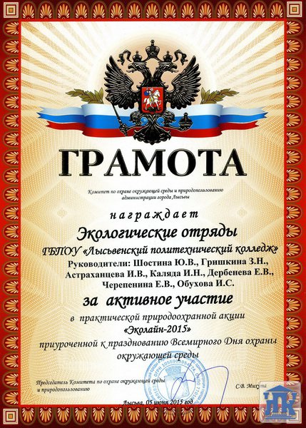 В честь праздника студенты получили торты, конфеты и шоколад, а также были вручены грамоты от комитета по охране окружающей среды и природопользованию администрации города Лысьвы за активное участие в практической природоохранной акции.