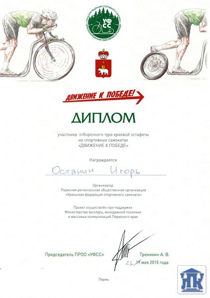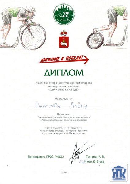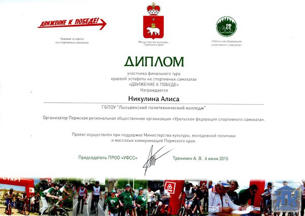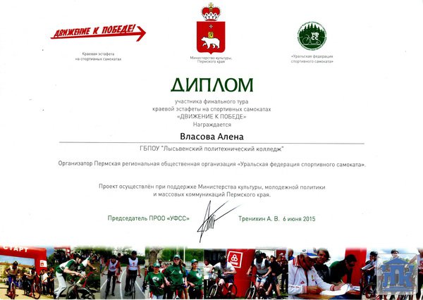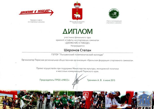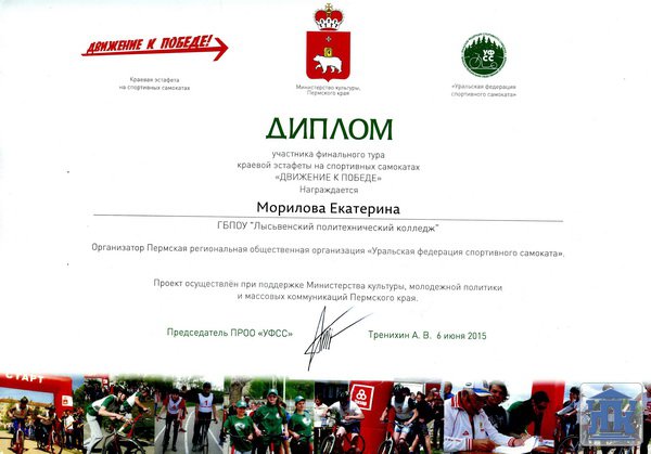 Впервые в этом году студенты нашего колледжа приняли участие в эстафете «Движение к Победе» на спортивных самокатах. Такую возможность предоставила нам Пермская региональная общественная организация «Уральская федерация спортивного самоката». Мероприятие прошло в рамках социально-значимых проектов Министерства культуры и молодёжной политики Пермского края «Прикамский витамин» и было приурочено к 70-летию Победы в Великой Отечественной войне.