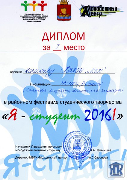 Старкова Елизавета и Ахметшина Эльмира представили на суд жюри два танцевальных номера, которые имели разноплановый характер: зажигательный «Русский пляс» и романтическая танцевальная композиция «Вечность». Выступление наших студенток тронуло сердца жюри, и танец «Вечность» в исполнении Эли и Лизы удостоен почетного 1 места. Очень приятно, оказавшись впервые на сцене города Чусового, получить столь высокую награду.