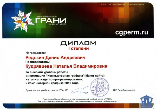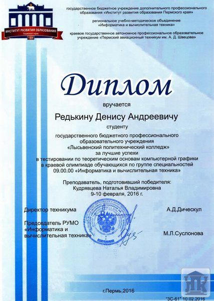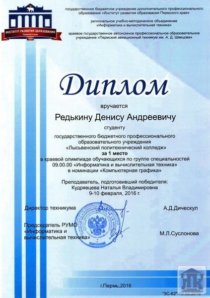 Поздравляем студента группы 48-КС Редькина Дениса с победой в краевой олимпиаде обучающихся по группе специальностей 09.00.00 «Информатика и вычислительная техника» в номинации «Компьютерная графика»!