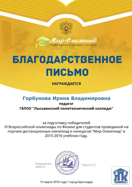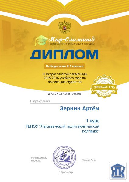 15 марта были подведены итоги III Всероссийской олимпиады по Физике для студентов, проводимой на портале «Мир олимпиад» в 2015-2016 учебном году.