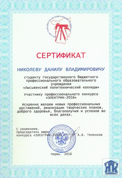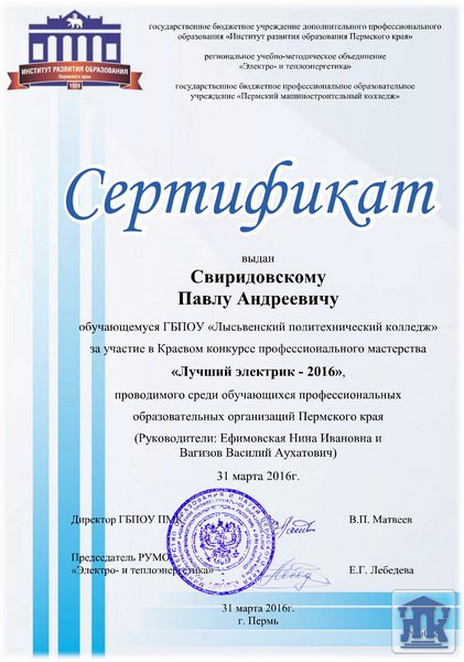 В Краевом конкурсе профессионального мастерства среди обучающихся профессиональных организаций Пермского края «Лучший электрик – 2016» от колледжа выступал Свиридовский Павел (33-ЭМ). По теоретической подготовке он занял третье место, по итогам всех испытаний – 6 место. Всего в конкурсе приняли участие 21 человек.