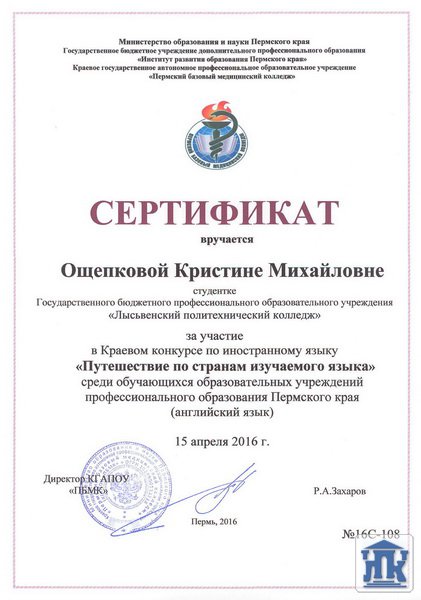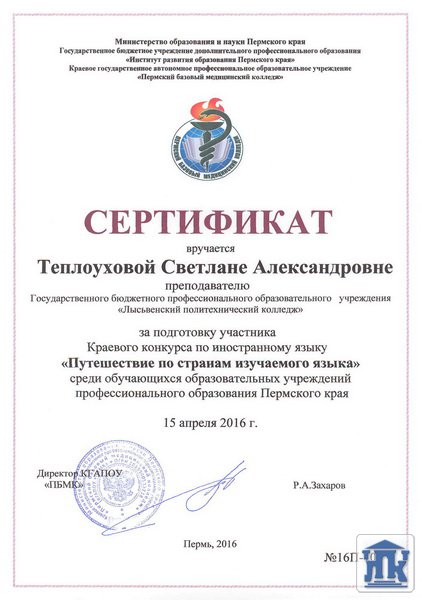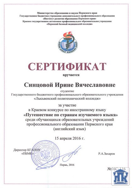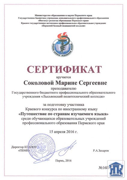 15 апреля прошел Краевой конкурс по иностранному языку «Путешествие по странам изучаемого языка» среди обучающихся образовательных учреждений профессионального образования Пермского края. Студенты колледжа (корпус 1) приняли в нем участие.