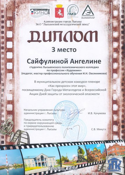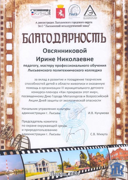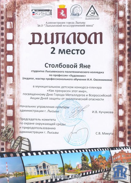 В сентябре подведены итоги муниципального детского конкурса-пленэра-2016. Пленэр – работа художников на открытом воздухе в естественных условиях (а не в мастерской) на основе непосредственного изучения натуры. Это единение художника и природы. Группа 304-14-ХД (корпус 2) в составе 13 человек во главе с мастером производственного обучения Ириной Николаевной Овсянниковой с воодушевлением работали на открытом воздухе. Назойливые комары и мошки не слишком отвлекали внимание художников, всех объединяло трудолюбие, неподдельный интерес к работе и, конечно же, к окружающей всех красоте природы. Погода порадовала тёплыми солнечными деньками. Кын - великолепное место для пленэрных этюдов и зарисовок! Успехи ребят не остались незамеченными, всех студентов отметили сертификатами участия: Гребеневу Светлану, Зыкина Дениса, Куклину Екатерину, Растягаеву Анастасию, Уракова Павла, Бучину Екатерину, Бурдину Веронику, Демосюк Татьяну, Кузьмина Данила, Мокину Марию, Смирнову Анастасию. Диплом 2 степени вручен студентке Столбовой Яне, диплом 3 степени – Сайфулиной Ангелине. Огромное спасибо мастеру производственного обучения, Ирине Николаевне Овсянниковой за развитие студентов. Администрация Лысьвенского городского округа объявила благодарность Ирине Николаевне за вклад в развитие творческих способностей детей в области живописи. Желаем вам дальнейших творческих успехов! А всех желающих посмотреть на работы юных художников мы приглашаем на нашу выставку в колледж!