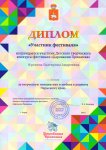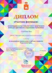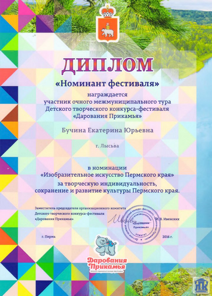 В этом фестивале приняли участие студенты Лысьвенского политехнического колледжа (корпус 2) под руководством Овсянниковой И.Н. Дипломы участников в номинации «изобразительное искусство» получили 9 человек и дипломы победителей заочного тура – 4 человека: Столбова Яна, Сайфулина Ангелина, Бучина Екатерина, Смирнова Анастасия. Также победителем заочного тура в номинации «мода» стала коллекция «Цветы на живом холсте».
