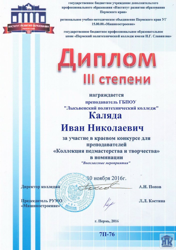 10 ноября подведены итоги краевого конкурса преподавателей «Коллекция педмастерства и творчества», проходившего в ГБПОУ «Пермский политехнический колледж имени Н.Г.Славянова».