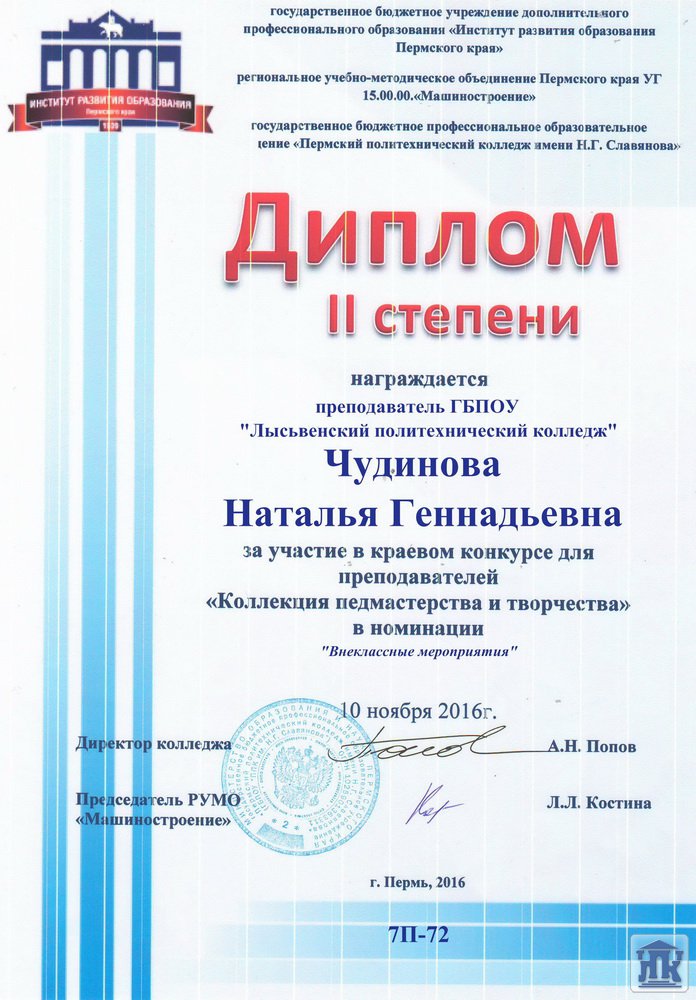 Дипломы II степени получили преподаватели Долгинцева Татьяна Николаевна, Чудинова Наталья Геннадьевна, Ширинкина Лариса Николаевна. Диплом III степени – Каляда Иван Николаевич. Сертификатами участников отмечены Горбунова Ирина Владимировна, Дербенёва Елена Валентиновна, Нечаева Елена Борисовна и Ноговицын Николай Анатольевич.