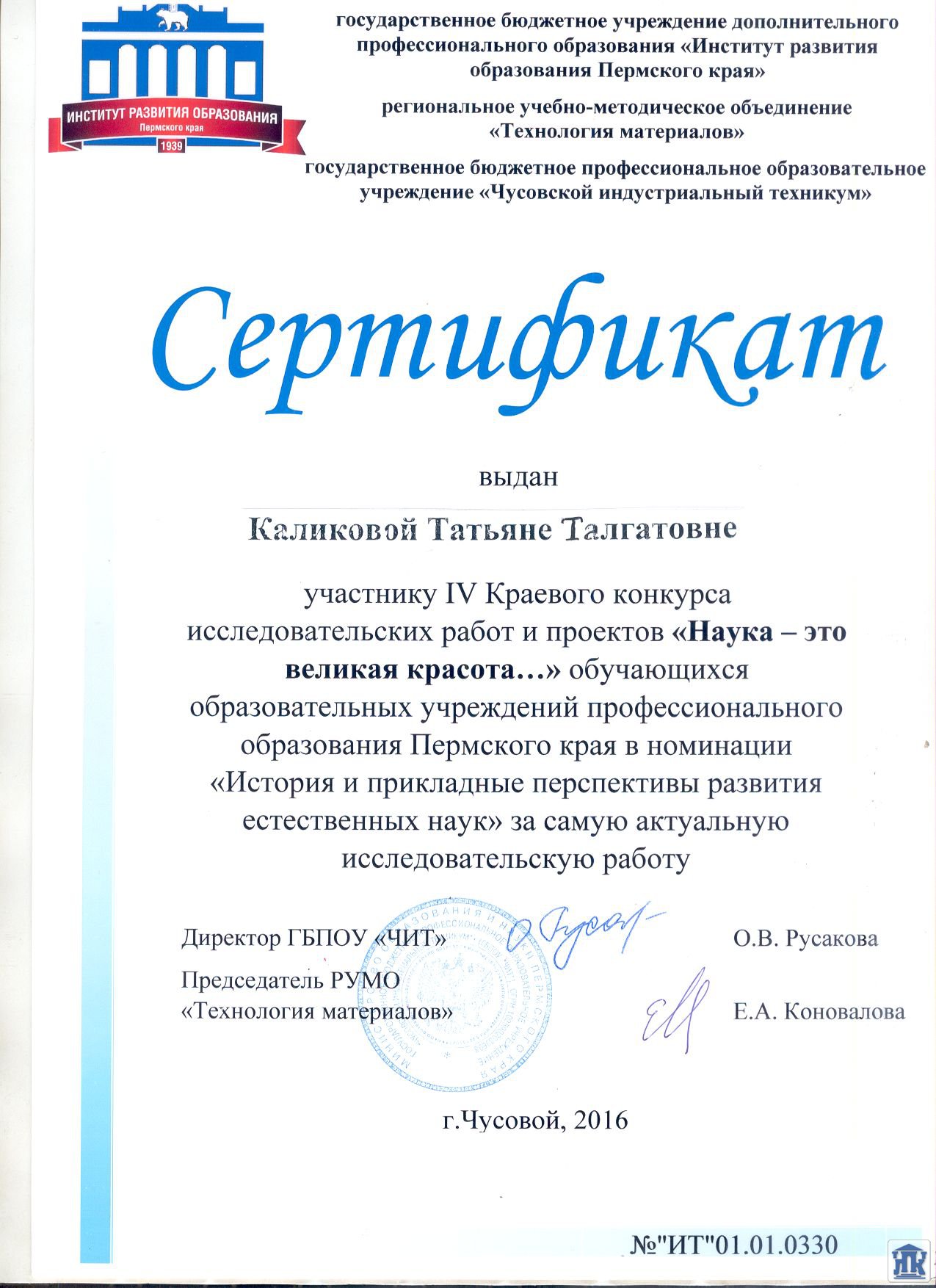 24 ноября в Чусовском индустриальном техникуме состоялся конкурс научно-исследовательских работ и проектов «Наука - это великая красота…». В этом году наш колледж (корпус 1) представляли Любовь Сединина с научно-исследовательской работой «Учимся читать английские научные и технические тексты» (руководитель - Теплоухова Светлана Александровна) и Татьяна Каликова с темой «Физические явления и кухонное электрооборудование» (руководитель - Гордеева Лариса Сергеевна). Жюри отметило Татьяну в номинации «Самая актуальная исследовательская работа».