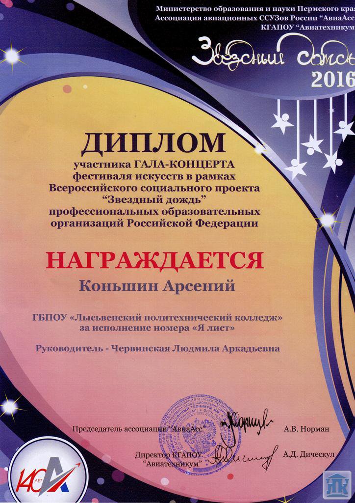 15 декабря студенты колледжа (корпус 1) традиционно приняли участие во Всероссийском социальном проекте «ЗВЕЗДНЫЙ ДОЖДЬ - 2016» среди профессиональных образовательных организаций РФ. Фестиваль традиционно состоялся в г.Перми на базе «Авиатехникума». На XI фестивале искусств «Звездный дождь - 2016» наш колледж представляли Коньшин Арсений, гр. 41-АВ и Чудинова Александра, гр. 15-16-ПР. Арсений исполнил песню «В комнате пустой», а Александра покорила зал жонглированием. Зал встречал ребят громкими аплодисментами, а у Арсения появилось много поклонников его творчества.