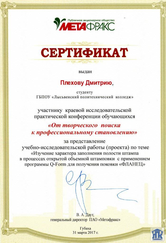 Плехов Дмитрий, студент третьего курса группы32-14-ОМД, занял 1 место в секции «Проектная деятельность». Тема его выступления – изучение характера заполнения полости штампа в процессах открытой объёмной штамповки с применением программы Q-Form, для получения поковки «Фланец». Первым выступать всегда сложно. Но Дмитрий своим спокойствием, уверенностью,грамотными ответами на многочисленные вопросы опытного жюри, доказал, что его проект заслуживает высокой оценки. Над этим сложным проектом также трудился егоодногруппник - Алексей Мошкин. Руководитель проекта – Чудинова Наталья Геннадьевна.