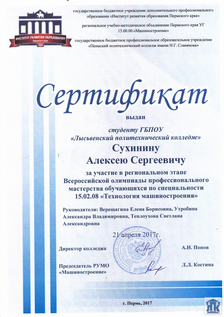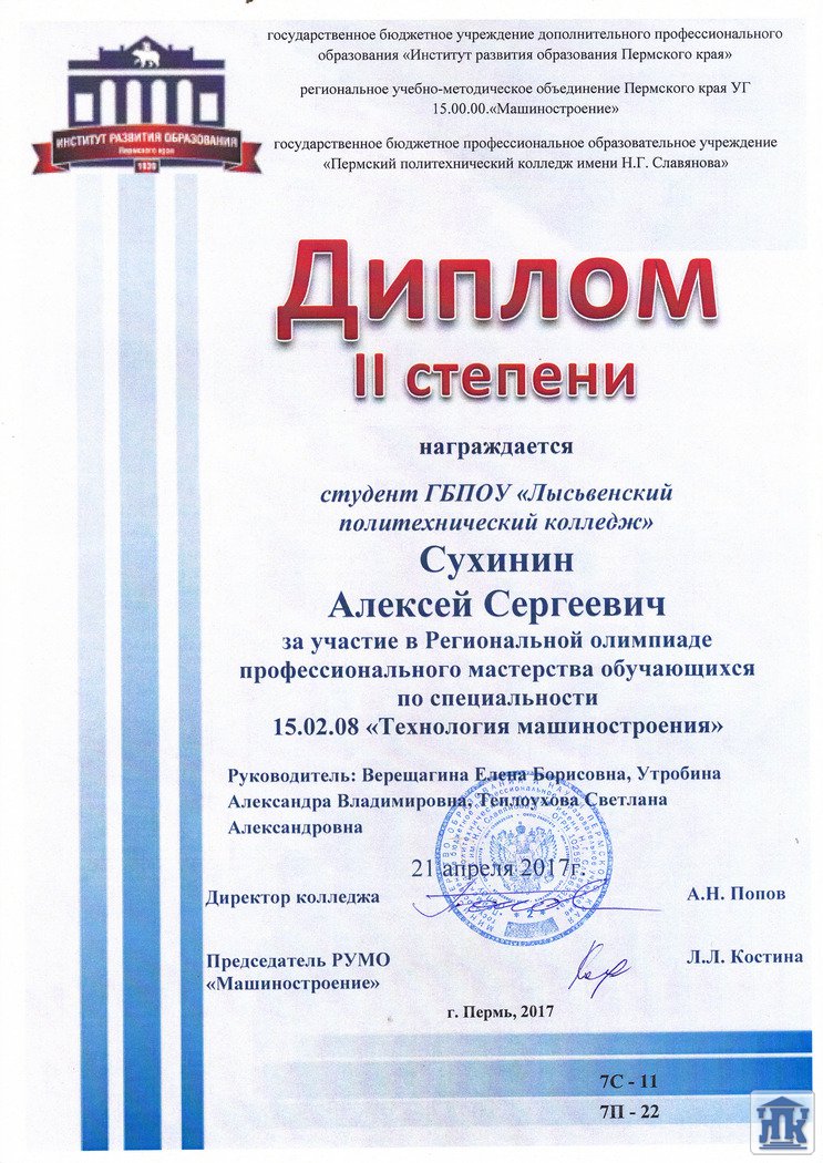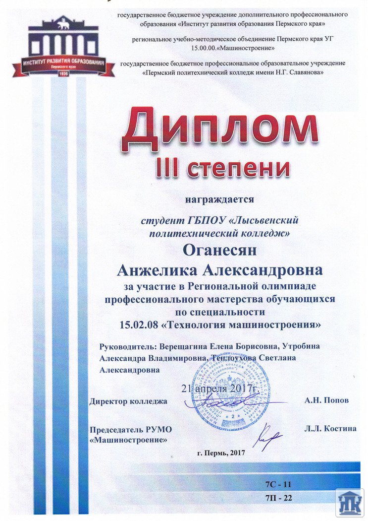 В пятницу 21 апреля, в ГБПОУ «Пермский политехнический колледж им. Н.Г.Славянова» прошла олимпиада по специальности 15.02.08 Технология машиностроения. Честь нашего колледжа отстаивали студентка группы 46-ТМ Оганесян Анжелика и студент группы 56-ТМ Сухинин Алексей. В общей сложности выполнение конкурсного задания заняло почти 5 часов! Первый этап включал в себя разработку чертежа и 3D-модели детали, разработку технологического процесса с заполнением маршрутной карты, операционных карт и карт эскизов. Второй этап состоял из двух не зависимых частей: перевода профессионального текста с английского языка и проверка теоретических знаний по спец. дисциплинам. По итогам испытаний 1 место поделили Хузин Александр (КГАПОУ «Пермский авиационный техникум им.А.Д.Швецова и Гурьянов Максим (ГБПОУ «Пермский политехнический колледж им. Славянова») 2 место занял Сухинин Алексей (ГБПОУ «Лысьвенский политехнический колледж» гр.56-ТМ) 3-место – Оганесян Анжелика (ГБПОУ «Лысьвенский политехнический колледж» гр.46-ТМ) Поздравляем победителей! Желаем дальнейших успехов!