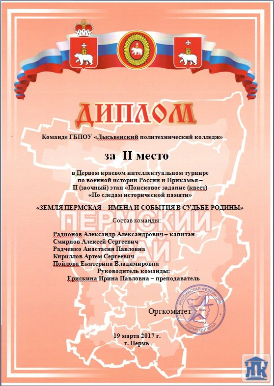 Задания 1 заочного этапа «Исторический триатлон» предусматривали решения задач по истории оружия, военной формы, родов войск, военной географии, знаменитых битв и решения историко-тактических задач по военной истории XIX в. Мы узнали очень много интересного, еще раз смогли убедиться в том, что нам есть чем гордиться. На этом этапе наша команда заняла 2 место. 2 заочный этап поисковый Квест «По следам памяти» дал нам возможность рассказать о нашем городе. В ходе квеста мы составили презентацию с рассказами и фотографиями о некоторых фактах истории Лысьвы: о Музее каски, о Герое ВОВ Сергееве Н.А, о нашем земляке Овчинникове И., обладателе ордена Золотой Звезды, о Доме графа Шувалова, о Мемориальном комплексе «Героям, павшим за революцию 1918ша коман-1922 г.» … И снова мы стали вторыми!