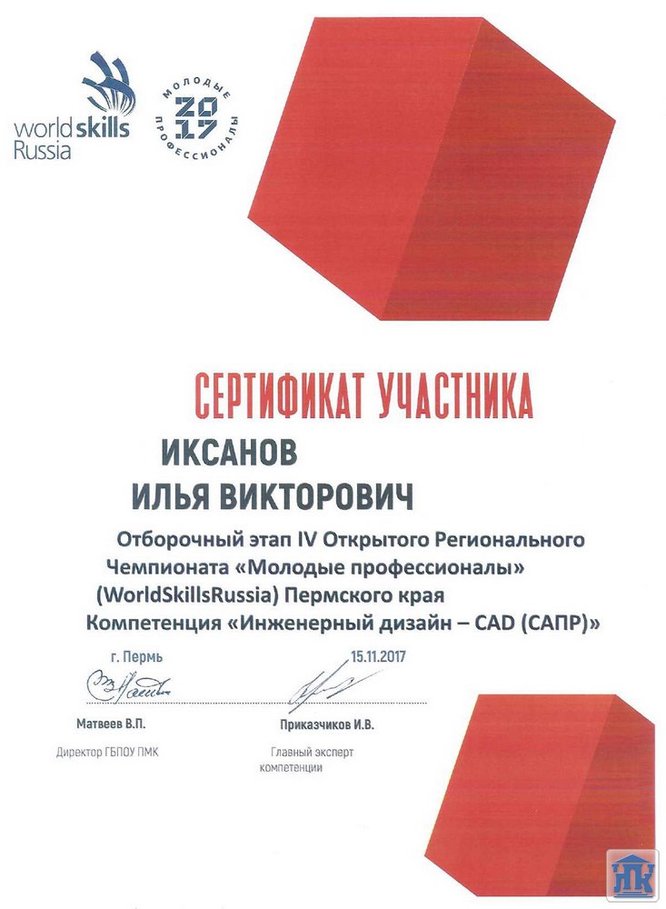Хотя для нашего колледжа чемпионат «WorldSkills Russia» явление не новое, но в компетенции «Инженерный дизайн» мы участвовали впервые. В отборочном туре участвовали 10 студентов от шести учебных заведений Пермского края. Наш колледж представляли студенты Васильевых Алексей (группа 36-15-ТМ) и Иксанов Илья (группа 46-14-ТМ).