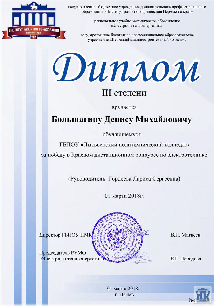 Подведены итоги краевого дистанционного конкурса по электротехнике. От нашего колледжа приняли участие 8 студентов. Наилучшие результаты показали Батыршин Максим (группа 29-16 СВ), Чабин Никита (группа 24-16-ЭО) и Большагин Денис (группа 24-16-ЭО).