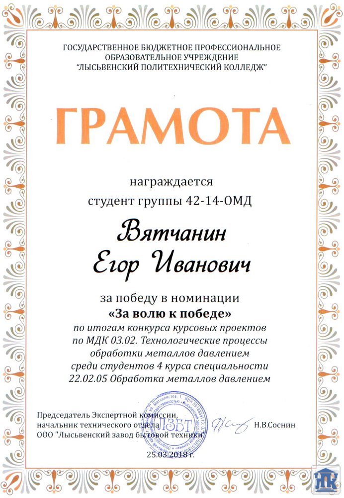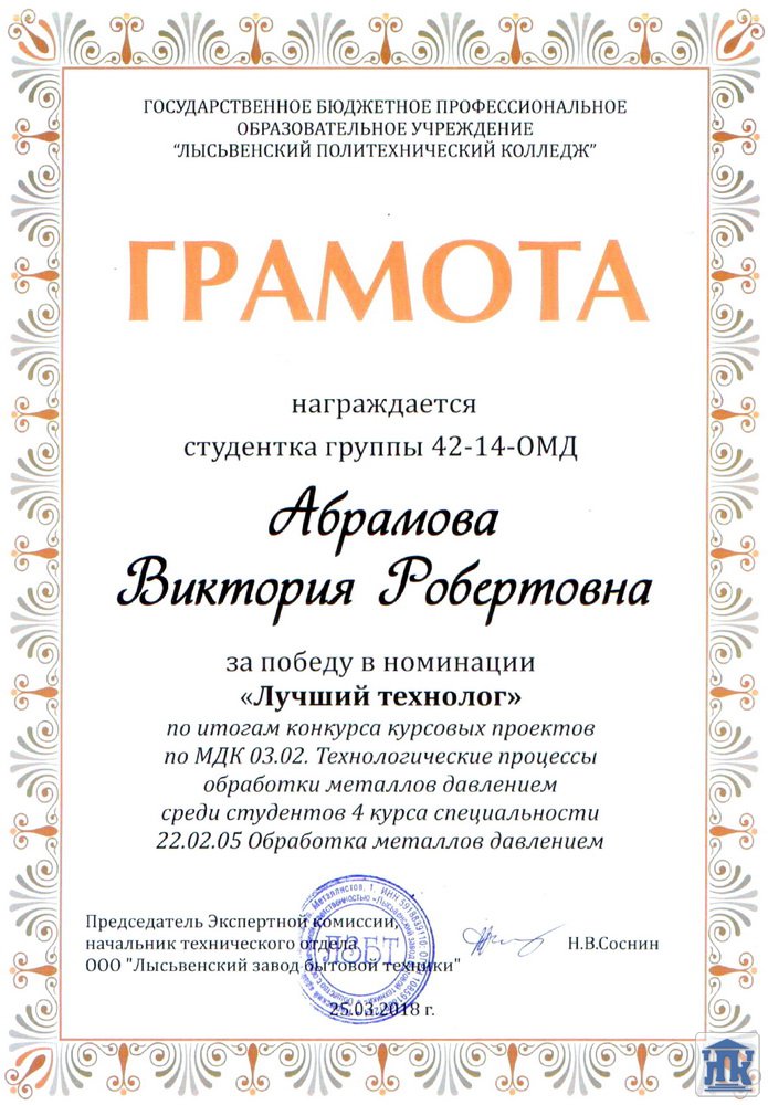 По итогам конкурса определены победители в номинациях: - «Лучший курсовой проект по специальности 22.02.05 Обработка металлов давлением» – Плехов Д., Мошкин А.;