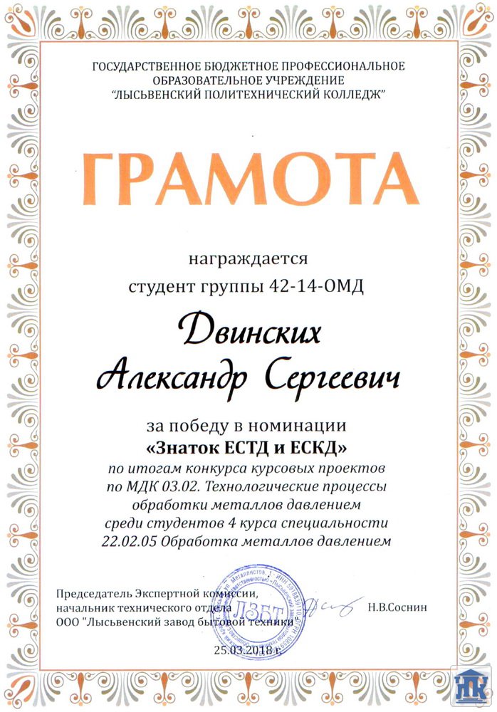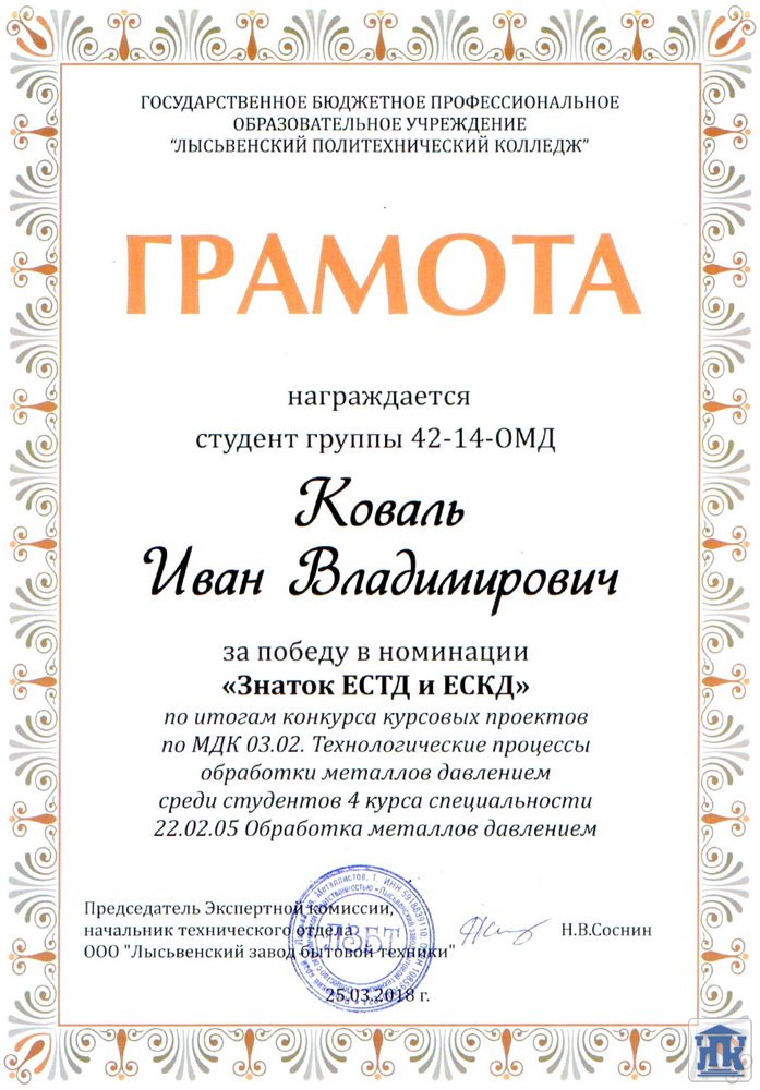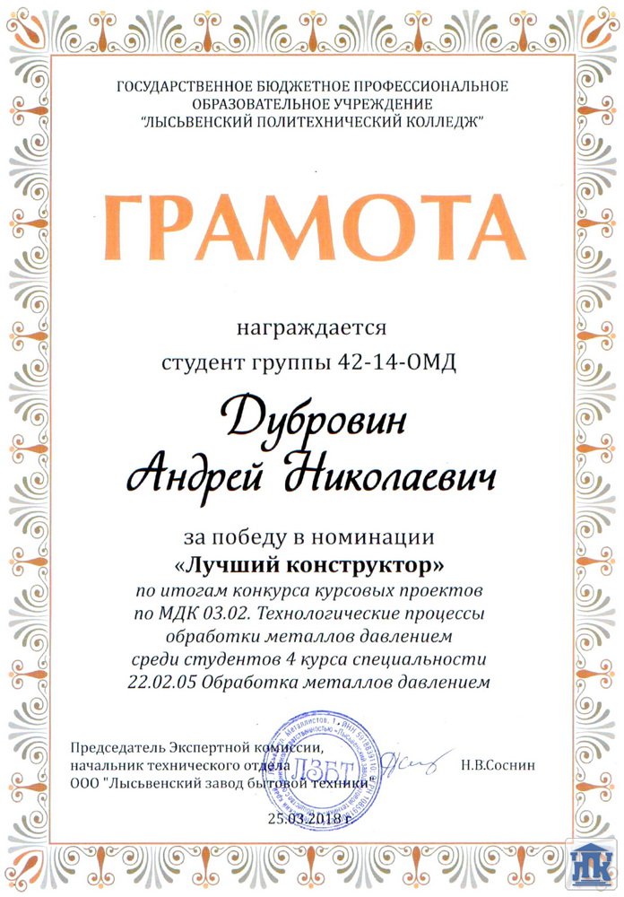 С 1 по 25 марта проходил конкурс курсовых проектов по МДК 03.02. «Технологические процессы обработки металлов давлением» среди студентов 4 курса группы 42-14-ОМД специальности 22.02.05 «Обработка металлов давлением».
