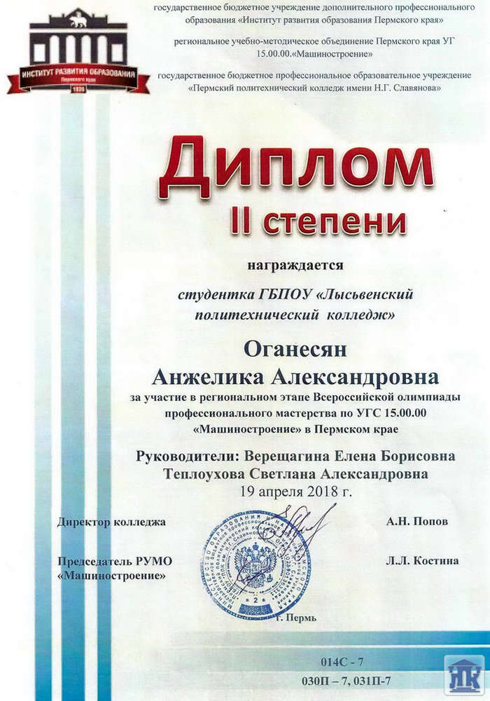 Участником от «ГБПОУ Лысьвенский политехнический колледж» по специальности 15.02.08 «Технология машиностроения» была студентка 5 курса группы 56-ТМ Оганесян Анжелика Александровна. Пройдя все сложные этапы олимпиады, в большой конкуренции, Анжелика продемонстрировала свои знания по специальности и заняла 2 место.