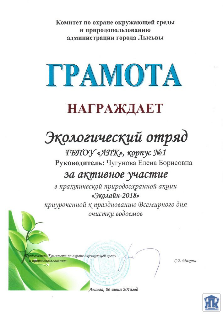 6 июня в рамках празднования Всемирного дня очистки водоемов состоялась традиционная акция «Эколайн-2018», в ходе которой ребятам удалось посоревноваться интеллектуально. В рамках городской акции «Зеленый город» студенты колледжа прибрали городской парк.