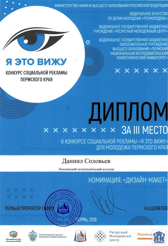 Наше учебное заведение представили студенты Овечкин Артем, Шардин Егор, Шумков Павел (студенты группы 34-16-ЭО) с роликом за здоровый образ жизни, Баталов Антон и Соловьев Даниил (группа 38-16-КС) с дизайн-макетами в номинации «Эко-логично». Поздравляем Соловьева Даниила с 3 местом и ребят с участием в замечательном конкурсе.
