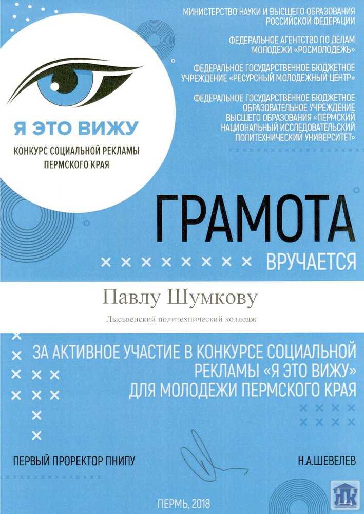 В конкурсе социальной рекламы Пермского края «Я это вижу» приняло участие 700 человек и было представлено 422 работы. Со всего края – Елово, Лысьва, Кудымкар, Березники, Соликамск, Кунгур, Ильинский, Краснокамск, Пермь ребята представили свои работы.