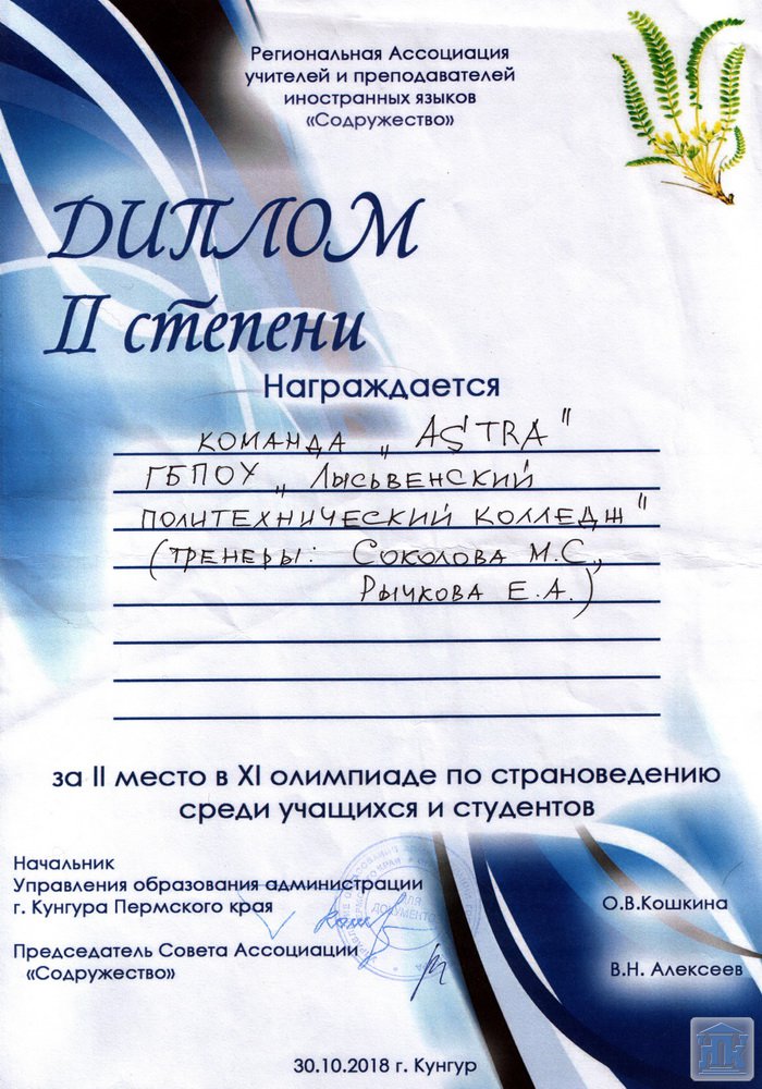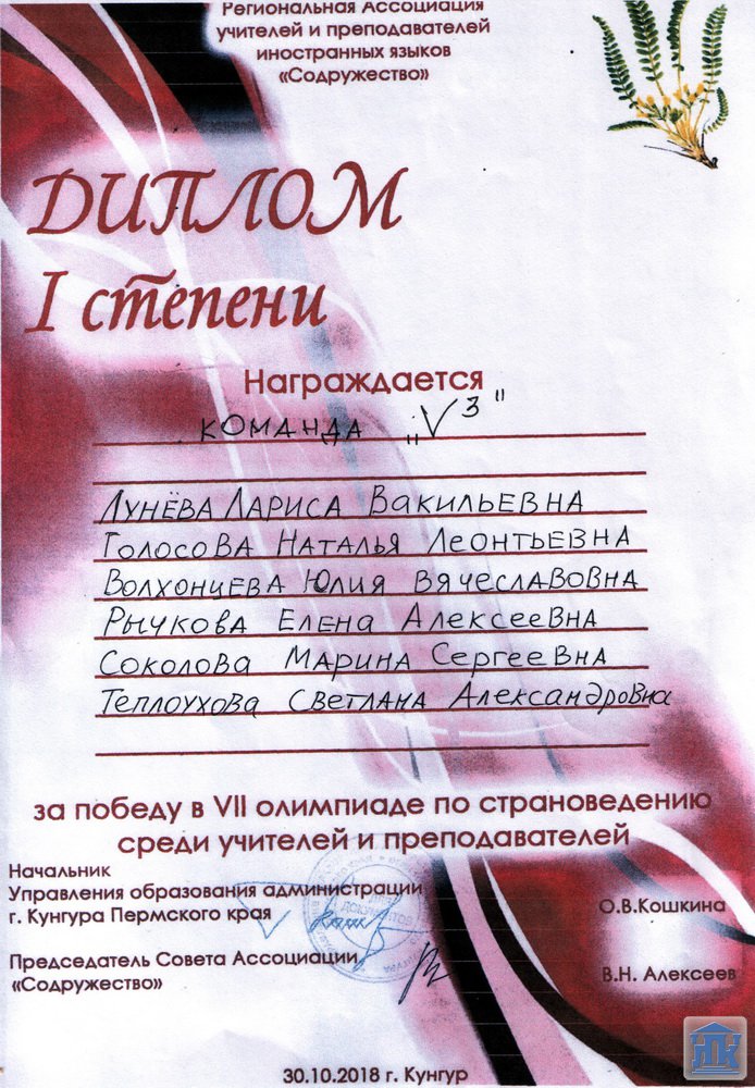 В этот же день состоялась VII страноведческая олимпиада среди учителей и преподавателей иностранного языка. Сборная команда города Лысьвы, в состав которой вошли преподаватели колледжа Соколова Марина Сергеевна, Рычкова Елена Алексеевна и Теплоухова Светлана Александровна, заняла 1 место.