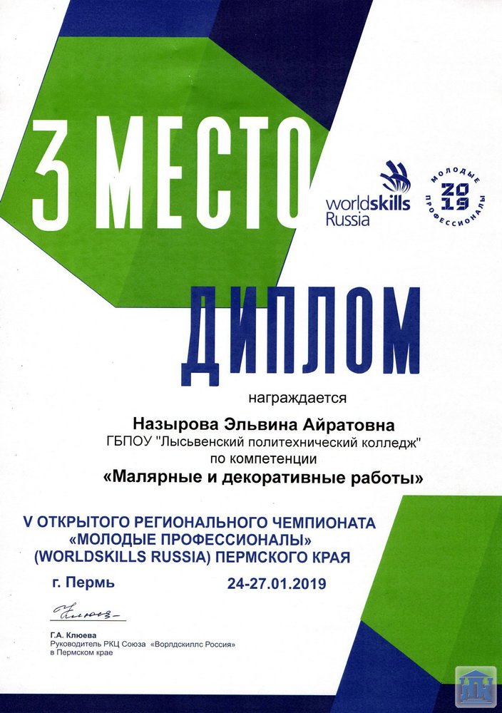 С 24 по 27 января прошел V Открытый Региональный чемпионат «Молодые профессионалы» (WorldSkills Russia) Пермского края. По компетенции «Малярные и декоративные работы 22» участвовала Назырова Эльвина Айратовна из группы 308-16-МСР, она заняла 3 место. Поздравляем Эльвину за хорошие выступления и желаем дальнейших успехов.