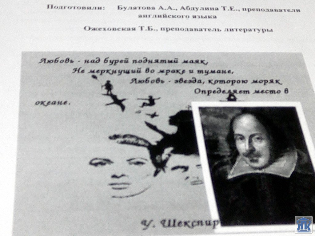В международный день английского языка и в день рождения знаменитого английского драматурга Уильяма Шекспира – 23 апреля – в рамках предметной недели в группе 208-17-МСР прошёл открытый интегрированный урок по литературе и английскому языку, который провели преподаватели Абдулина Т.Е., Булатова А.А., Ожеховская Т.Б.