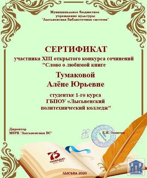 Подведены итоги муниципального XIII конкурса сочинений «Слово о любимой книге». Студентка группы 105-19-ПХ Тумакова Алена написала о своем любимом герое А.Соколове из рассказа М.Шолохова «Судьба человека» (преподаватель – Безденежных Т.А.).