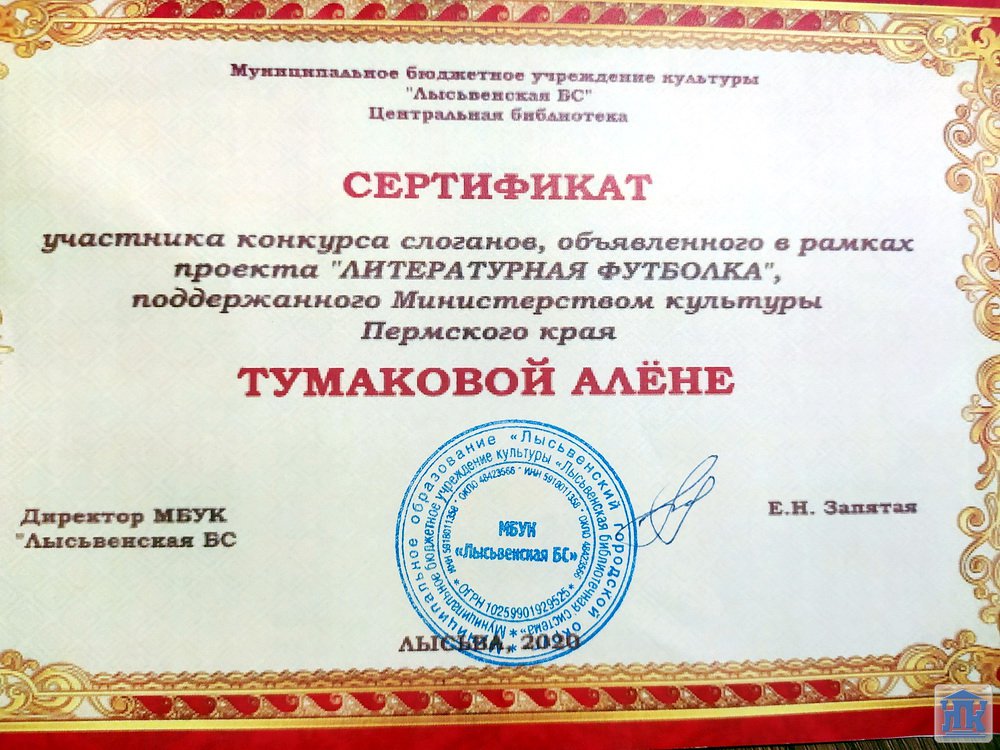 Подведены итоги городского конкурса, состоявшегося в рамках проекта «Литературная футболка», организованного при поддержке Министерства культуры Пермского края, где студентки колледжа Кабышева Ангелина и Тумакова Алена (группа 205-19-ПХ) приняли активное участие.