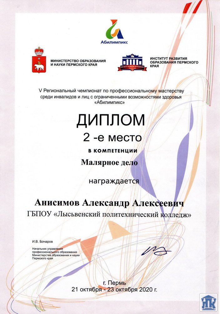 Наш колледж представляли 2 студента: Кротов Дмитрий (группа 309-18-ПВ) по компетенции «Поварское дело» и Анисимов Александр (группа 08-19-ШМ) по компетенции «Малярное дело». Оба юноши выступили на довольно высоком уровне и продемонстрировали готовность показать себя в профессиональных компетенциях. Дмитрий вошел в пятерку сильнейших, а Александр занял 2 призовое место.