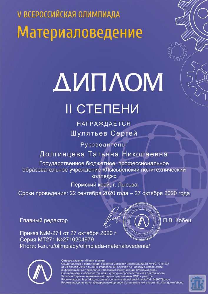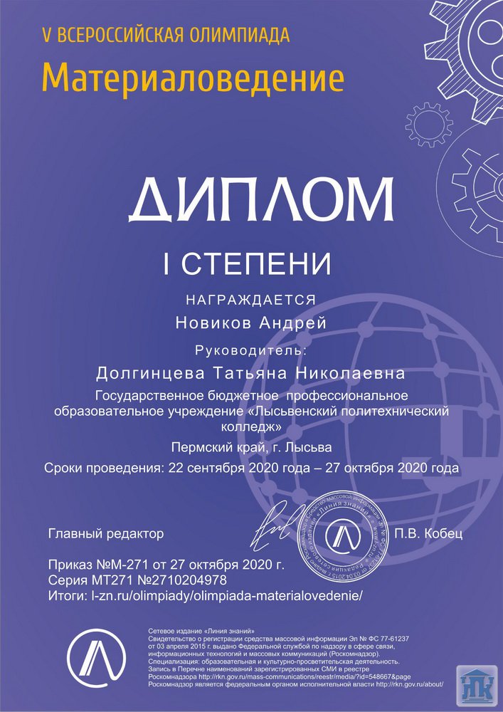 С 22 сентября по 27 октября проходила V Всероссийская олимпиада по материаловедению. Студенты колледжа приняли активное участие и получили дипломы 1 и 2 степени. Я благодарю их за активное участие, желаю успехов в учёбе и новых побед!