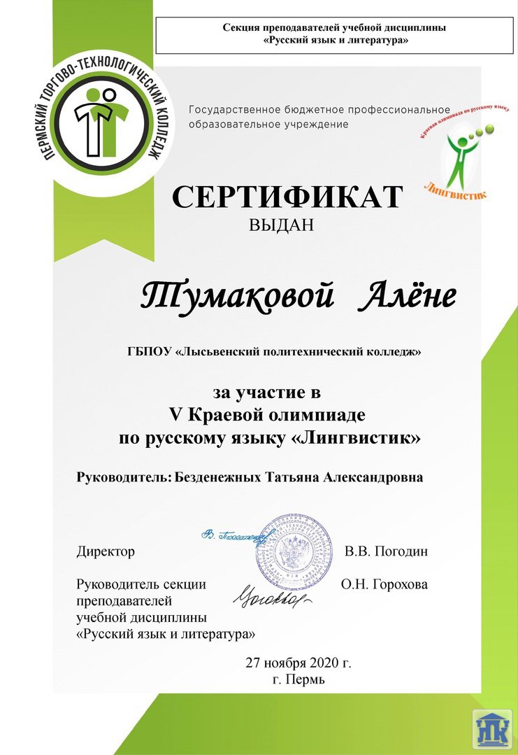 27 ноября состоялась Краевая олимпиада по русскому языку «Лингвистик». Тумакова Алёна, студентка группы 205-19-ПХ, приняла в ней активное участие. Новый багаж знаний в копилке Алёны пополнен, так держать!