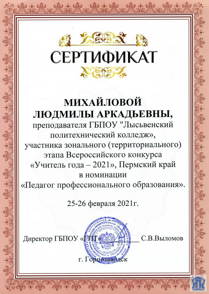 Поздравляем Людмилу Аркадьевну Михайлову с убедительной и яркой победой в зональном (территориальном) этапе Всероссийского конкурса «Учитель года – 2021» в номинации «Педагог профессионального образования», который проходил в Горнозаводске. Желаем творческих успехов и победы в краевом этапе конкурса!