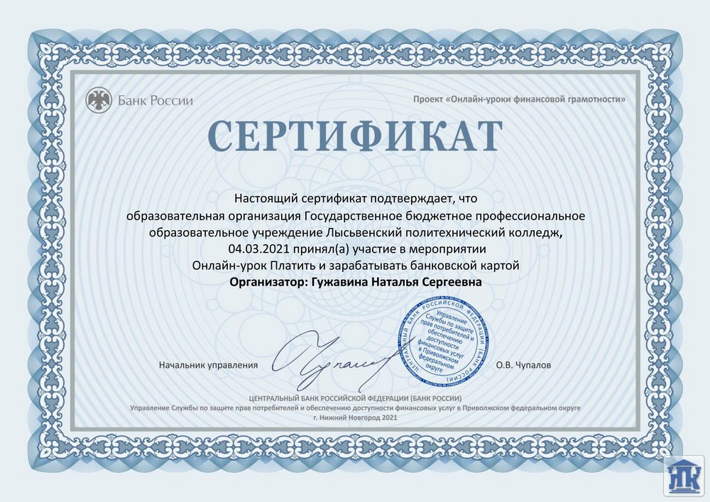 4 марта студенты ГБПОУ «Лысьвенский политехнический колледж» приняли участие в мероприятиях Международного проекта «Онлайн-уроки финансовой грамотности», который помогает ребятам из любой точки России получить равный доступ к финансовым знаниям, предоставляет возможность «живого» общения с профессионалами финансового рынка, способствует формированию принципов ответственного и грамотного подхода к принятию финансовых решений, – посетили онлайн-урок «Платить и зарабатывать пластиковой картой». Эксперты рассказывают школьникам о личном финансовом планировании, инвестировании, страховании, преимуществах использования банковских карт.
