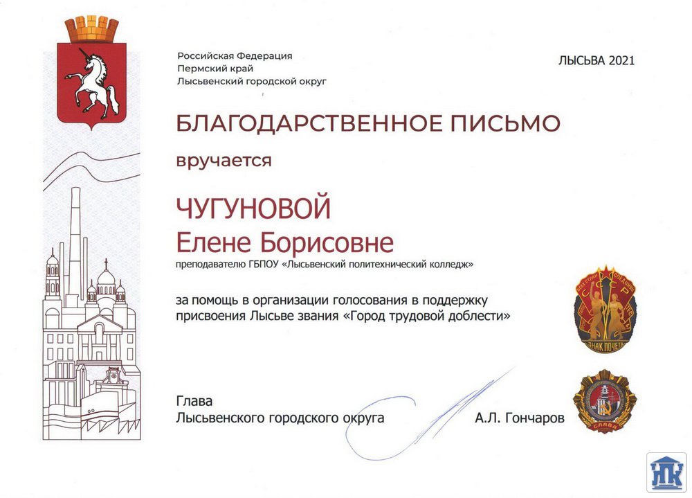 Лысьва в годы Великой Отечественной войны стала единственным городом, где выпускались каски для солдат Красной армии. Именно лысьвенская каска спасла жизнь миллионам солдат и стала символом мужества, стойкости и героизма, она венчает собой могилу Неизвестного Солдата у стен Кремля. Кроме того, Лысьвенский металлургический завод выпускал боеснаряды и продукцию для нужд обороны страны. Мы считаем, что наш город достоин этой государственной награды.